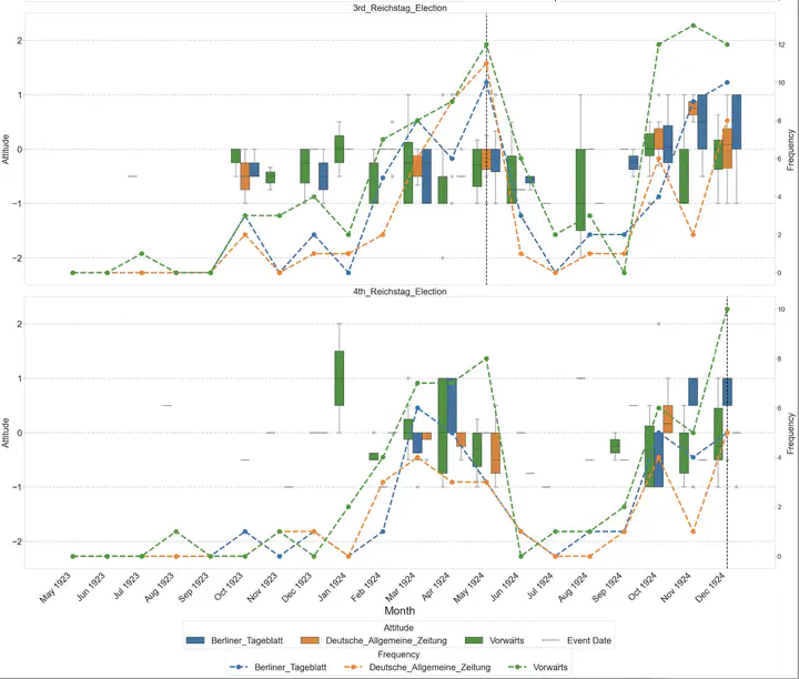 This study employs a mixed-methods approach, combining quantitative content analysis with qualitative discourse analysis. Our methodology includes event co-occurrence analysis, sentiment analysis, and comparative analysis of reporting frequencies and attitudes across the three newspapers. This approach aims to uncover reporting trends, language framing, and potential biases, illuminating how these newspapers shaped public opinion during this crucial period of the Weimar Republic.